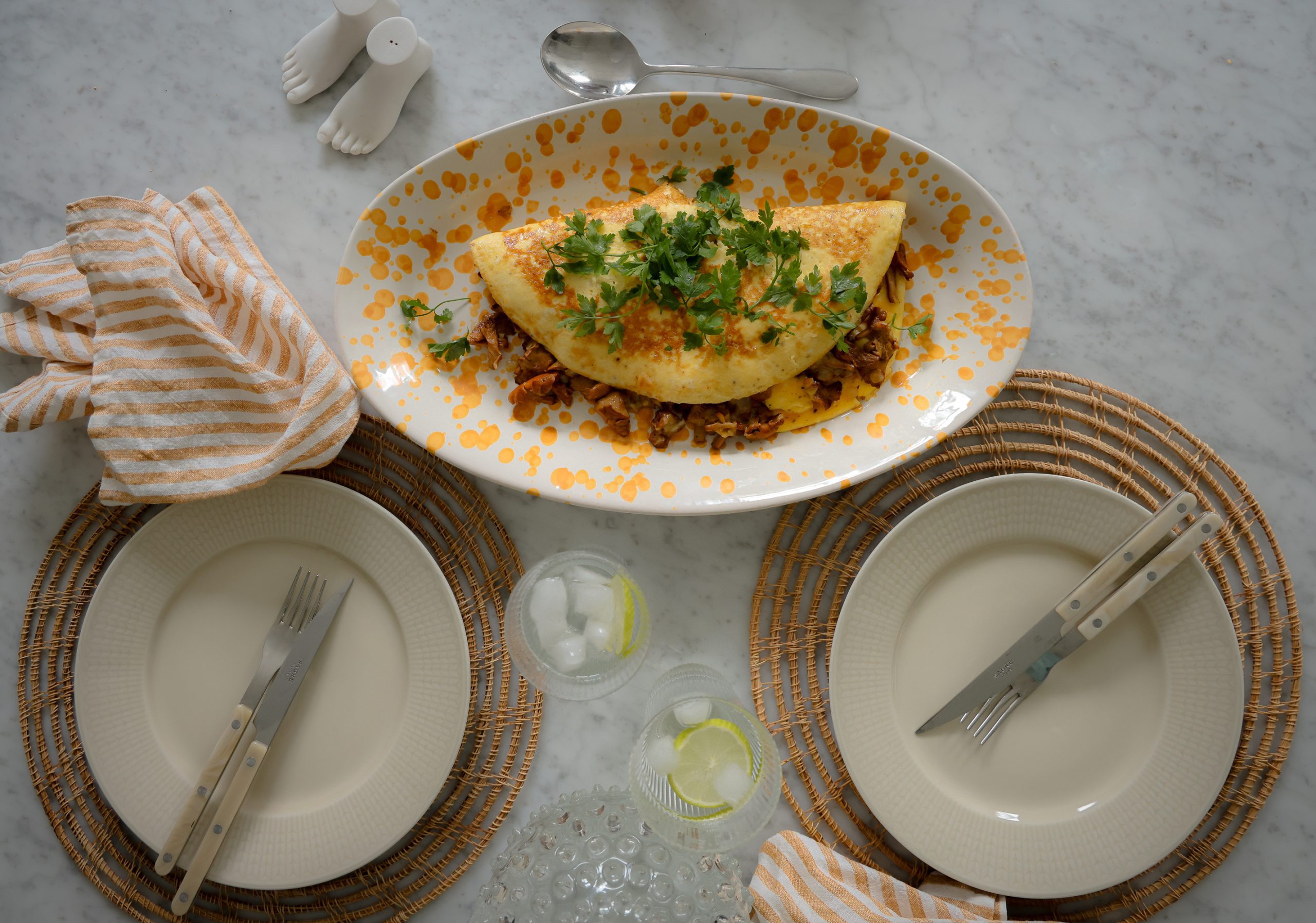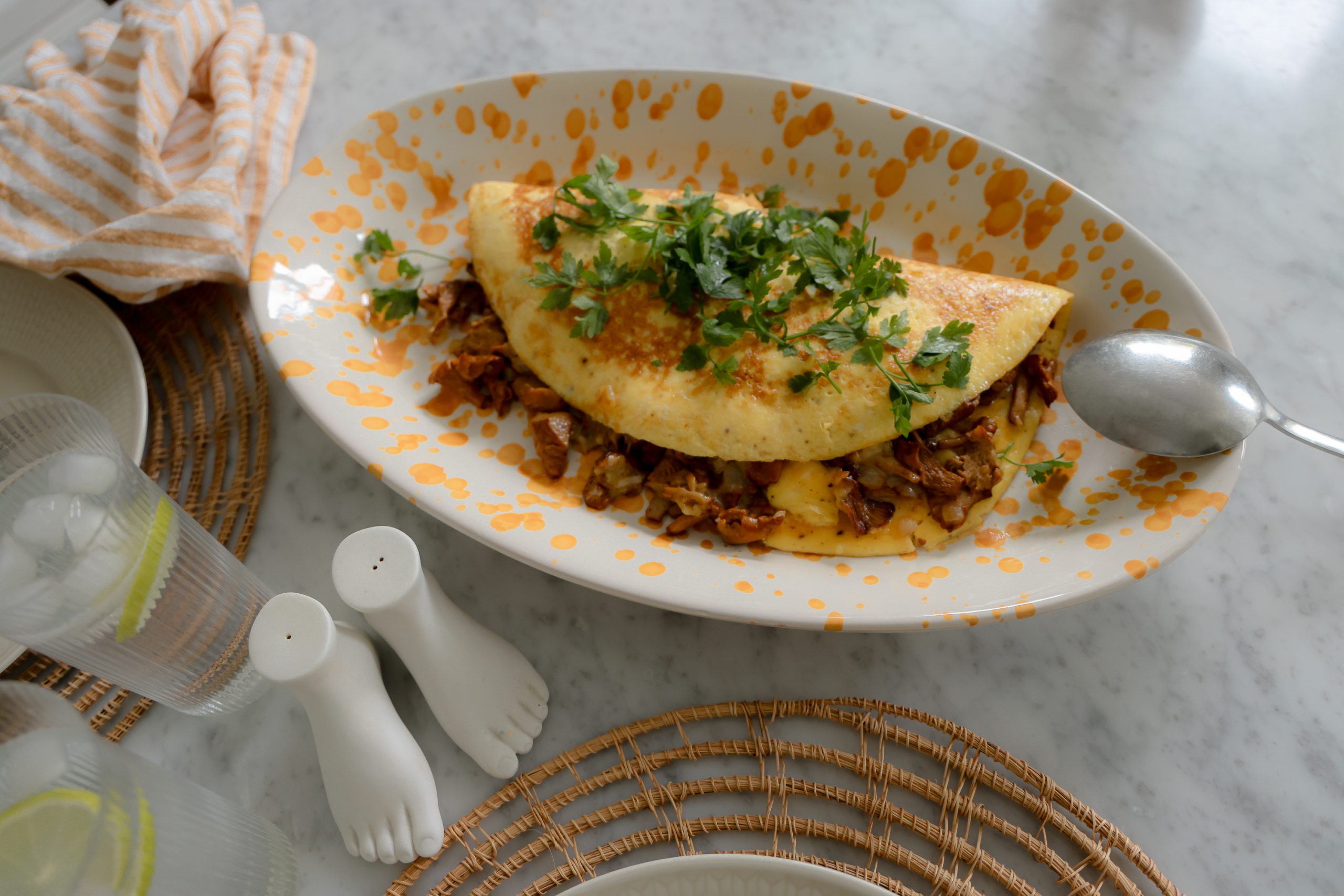 När omeletten släpper från kanterna och är krämig i mitten (inte lös) är den klar. Häll över riven parmesan och strö över kantareller. Stjälp sen upp den så den blir dubbelvikt på ett serveringsfat. Garnera bladpersilja. Mums