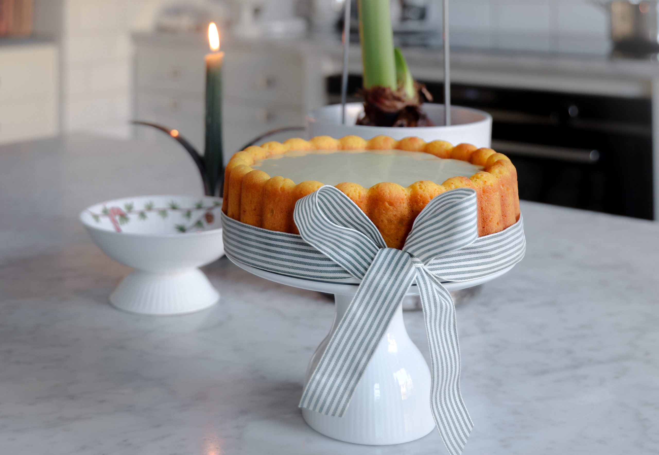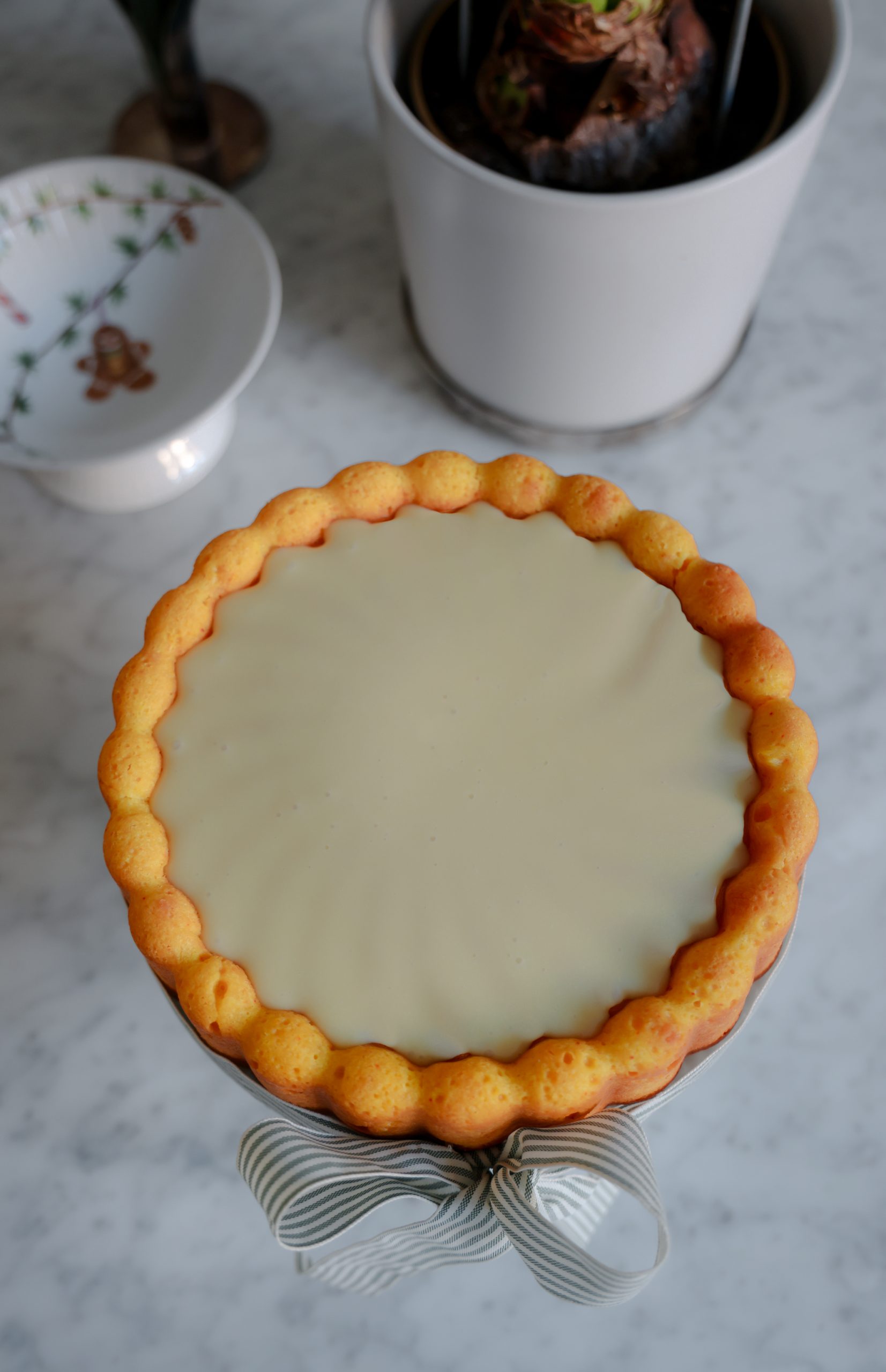 SAFFRANSKAKA MED MANDELMASSA & VIT CHOKLADGANACHE
