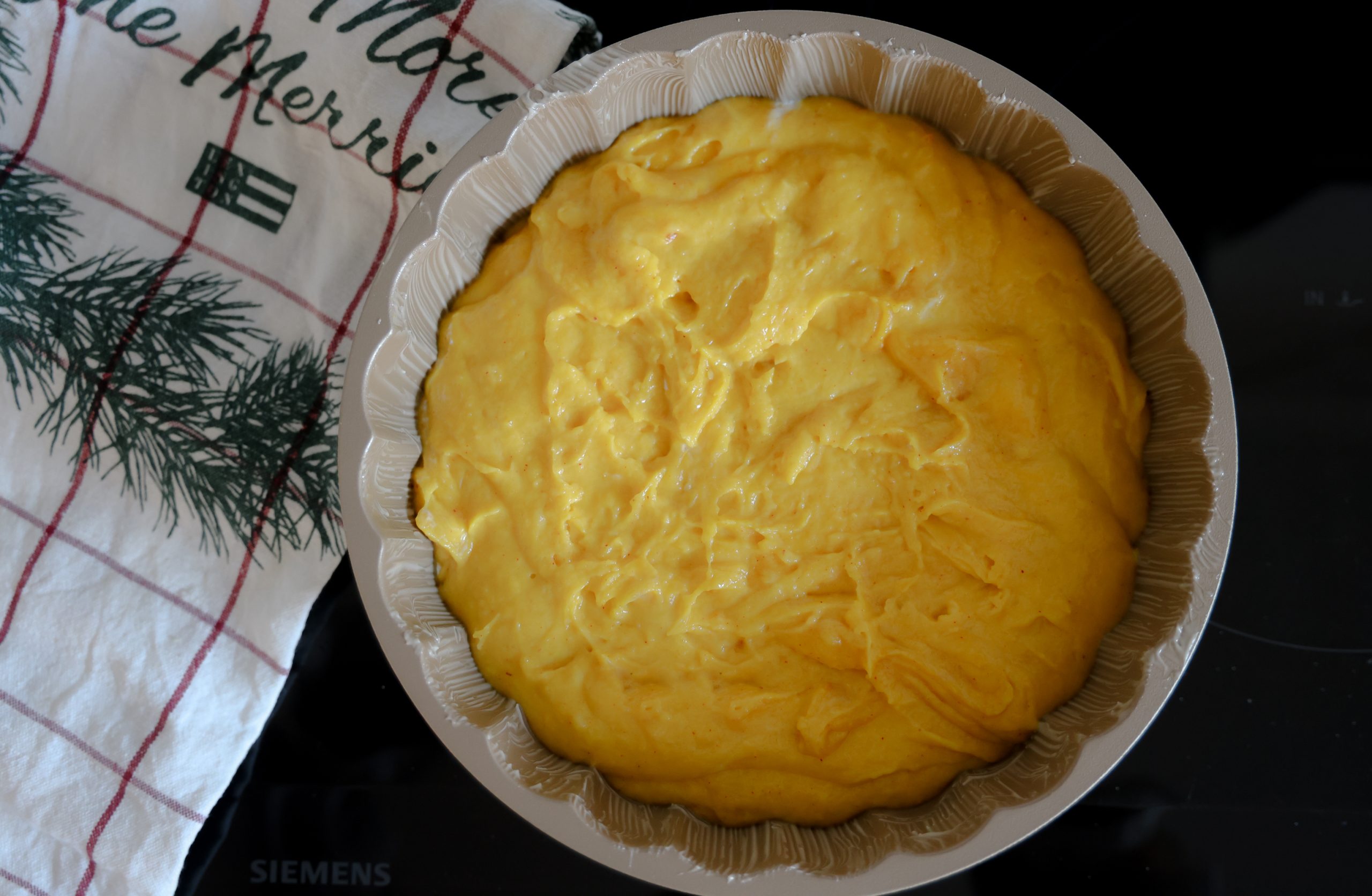 Häll smeten i formen och knacka formen mot bordet så att smeten kommer ner ordentligt (om du har en sån form som jag)