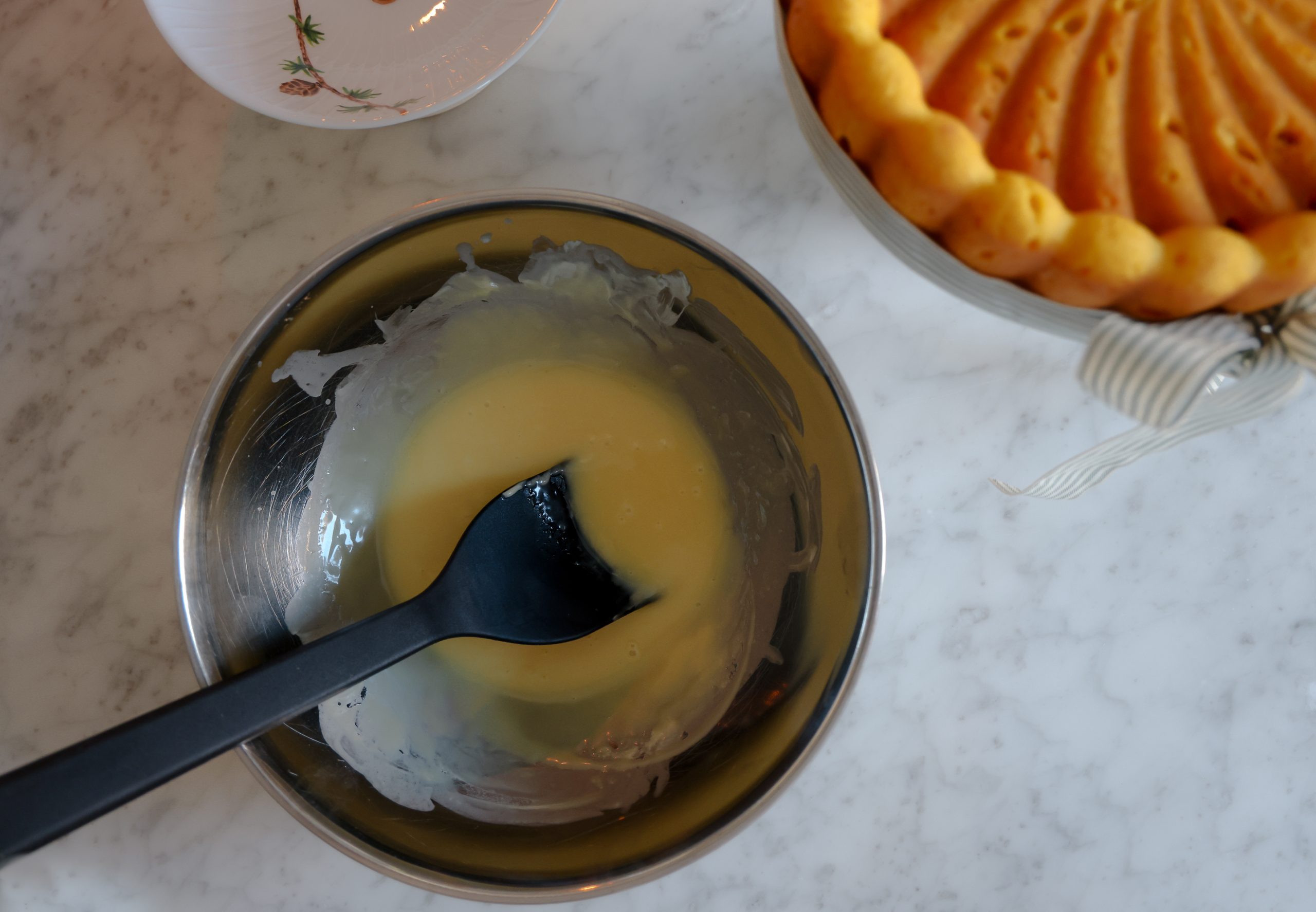 Smält smör i en kastrull. Vispa sen samman yoghurt, smör, ägg och saffran.